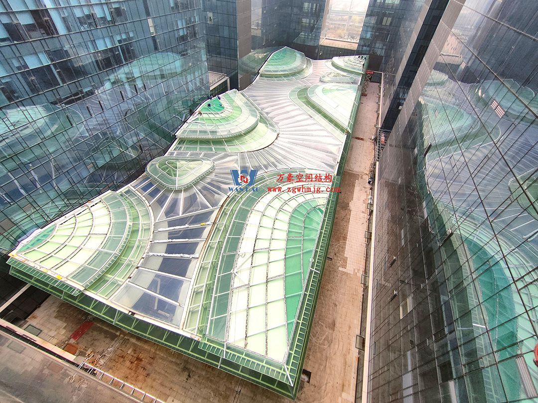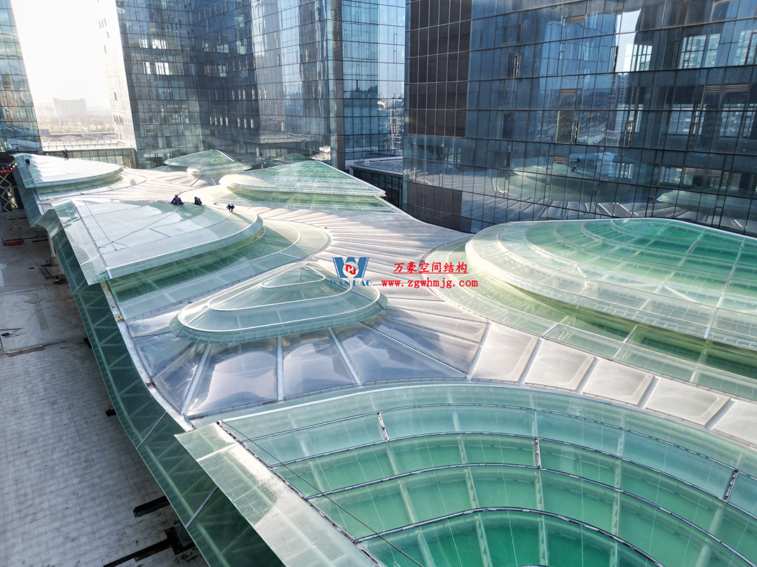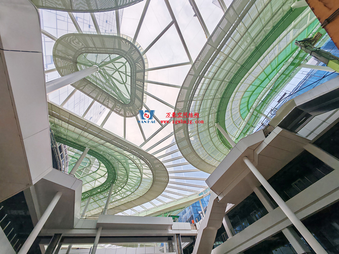 博多森谷項目中庭鋼膜結構工程位于余杭區良渚板塊,地處杭州城北,良渚未來核心區,城西科創大走廊輻射圈。該項目用鋼量約689噸,ETFE+網格織物膜展開面積12000平方米。