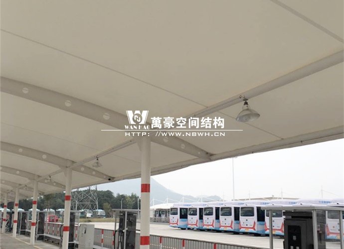 膜結構雨棚施工面積約5138平方;用鋼量約80噸。施工難點在于工期緊。施工時天氣情況差,連續的陰雨天給鋼構的油漆施工帶來了極大的麻煩并且延誤了工期。雨棚底下還要安裝充電樁,我們還要和充電樁施工班組進行技術對接,規劃充電樁的安裝位置。由于工期緊,天氣狀況差,我們動用了兩個施工班組加班加點,土建、鋼構交叉施工,最后如期完工。由于每個雨棚長度比較長,施工班組在立好鋼構件之后從中間開始往兩邊安裝膜布,使工作效率有了很大的提高。