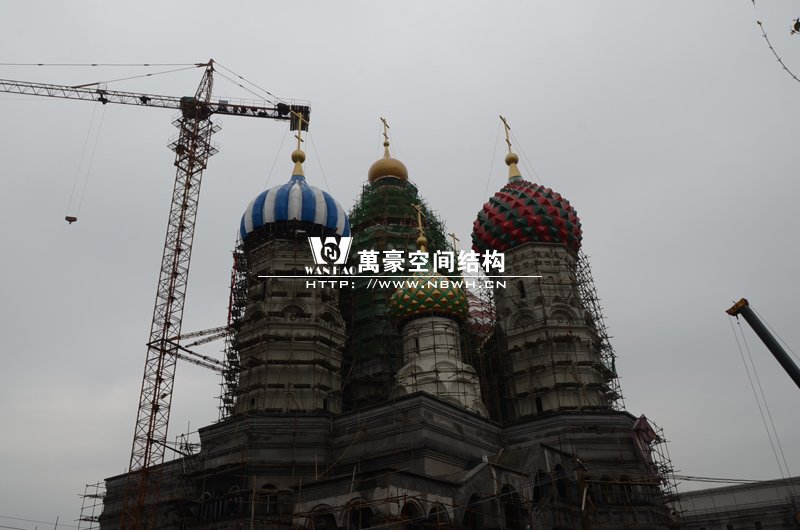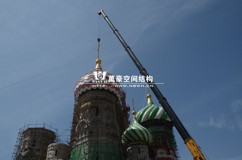 橫店影視城俄羅斯館屋頂鋼結構裝飾球吊裝完成,本次吊裝的九個裝飾采用鋼結構骨架、鋁合金外殼,最重的裝飾球達20來噸,采用300多噸的大吊車進行吊裝。