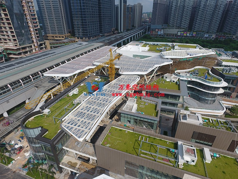 深圳龍華地鐵站ETFE天幕項目由我公司負責設計及承建,項目由4個出入口單體組成,ETFE展開面積9000平米,二次鋼結構120噸,結構落柱采用目前最流行的樹形節點支撐,在結構安全的同時更具層次感。同時該項目也完美突出了ETFE膜材高透光、高自潔性及耐高溫的優點。
