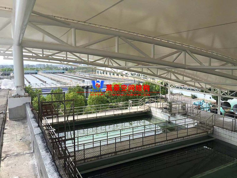 慈溪自來水廠污水池膜結構為工業設施配套工程。結構最大跨度40米,采用桁架結構外覆PVC膜材的形式,建筑面積5000㎡,用鋼量330噸,膜材用量6200㎡。項目施工難度大,實施階段考慮到實際運營的需要并保持自來水廠不受各項因素的干擾及污染(帶水作業),為該市的民生工程。